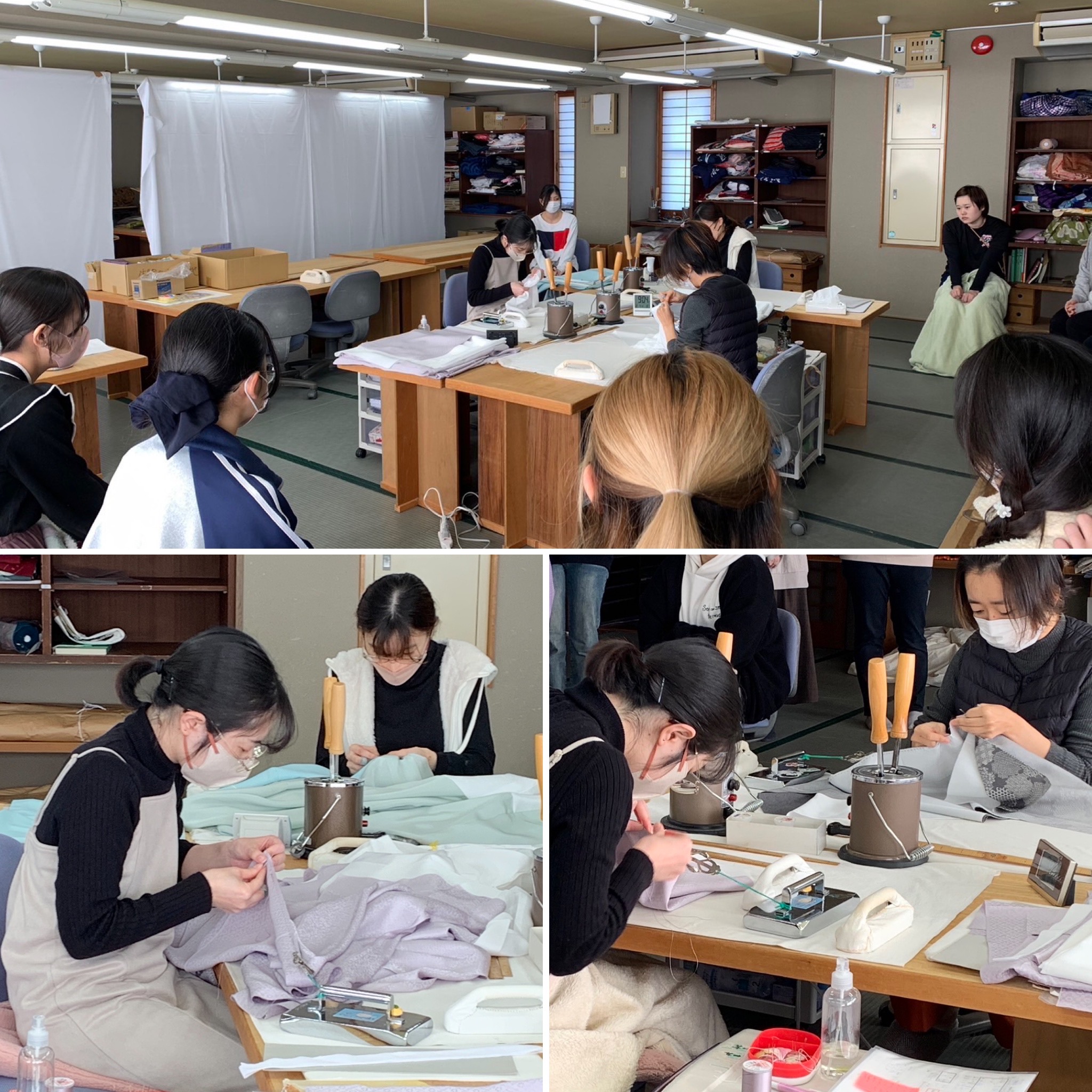 弊社には系列で辻村和服専門学校があり、普段なかなか先輩の仕立てている姿をじっと見る機会も少ないので、昨年同様学校の1部屋を使い、学生さんに公開して競技を行いました。学生さんたちも代わるがわる入室し、先輩の姿、手元、動作の流れ等を見ることができ、貴重な機会だったと思います。