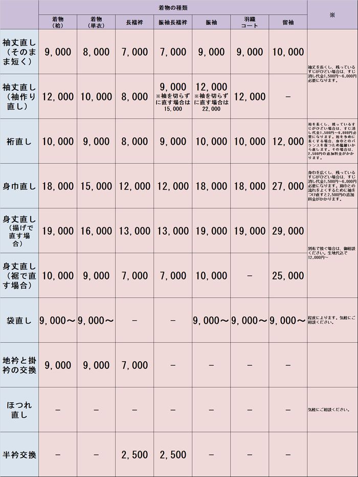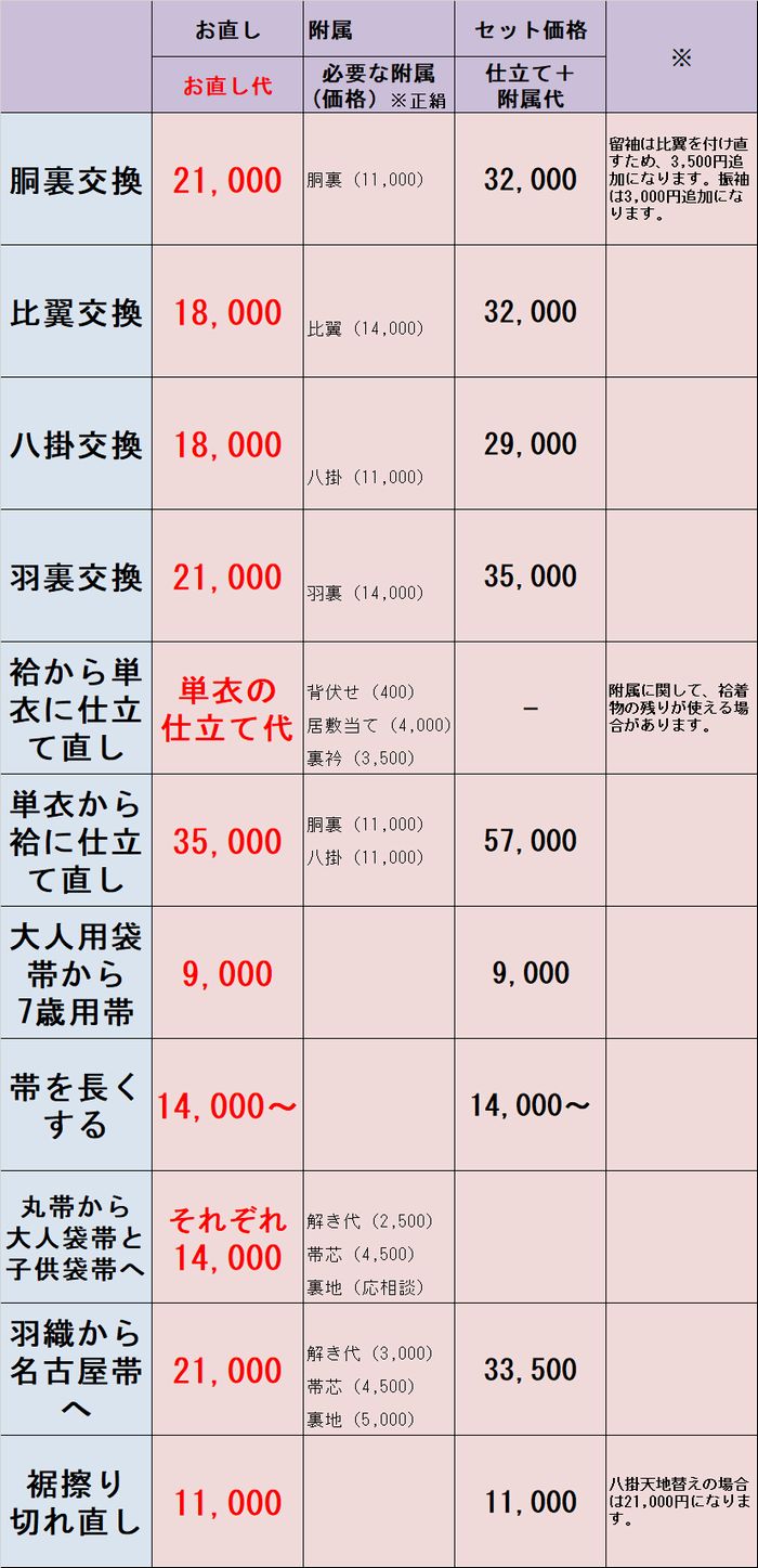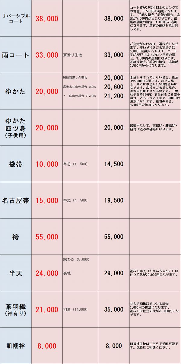 - 国家一級和裁技能士指定の場合、料金は2割増しのみでお仕立て、お直しいたします。
