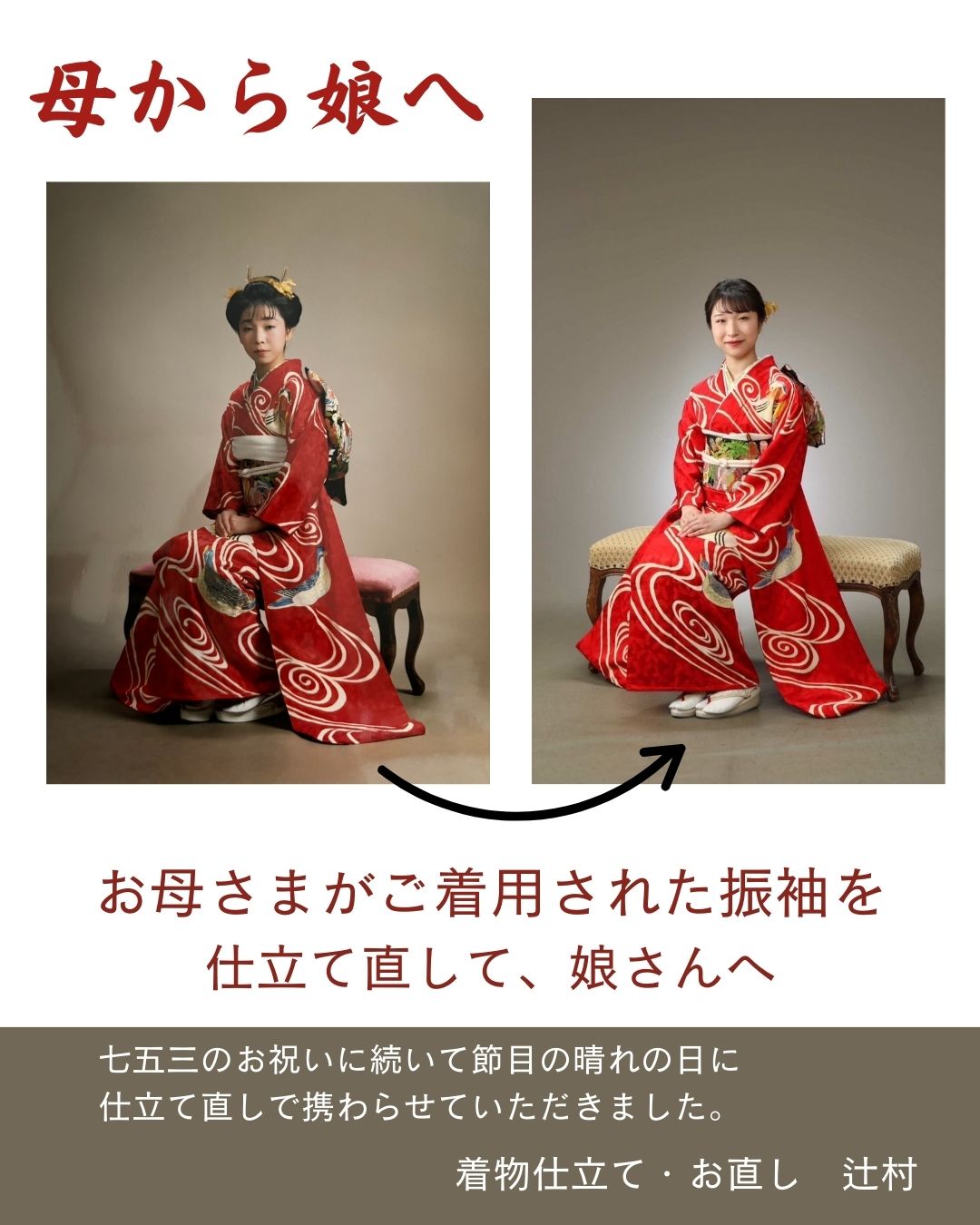 「ママ振り(ママ振袖)」は、ご家族のたくさんの思い出の詰まった大切な着物を大切にして受け継いでいく素晴らしいものです。